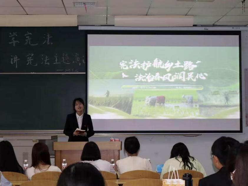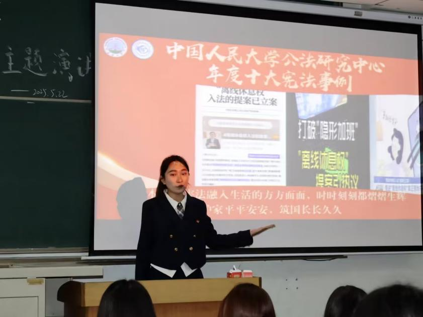 随着主持人周清鄂激情洋溢的开场白,比赛正式拉开帷幕。12 位参赛选手紧扣“学宪法,讲宪法”主题,结合社会热点、法律案例与个人经历,展开了极具感染力的演讲。杨婉婷同学以宪法文本为脉络,串联起乡村教育普及、基层治理革新等真实变迁,深情讲述 “宪法护航乡土路”的生动实践,让现场观众深切感受到宪法与民生的紧密联结;王羿茹同学则以某劳动权益纠纷案件为例,剖析宪法修正案对劳动者“离线休息权”的保障,凸显宪法作为“安邦定国之根基、人民权益之保障”的核心价值;其他选手亦通过“宪法与校园欺凌防治”“网络时代的人格权保护”等多元视角,将宪法精神融入生活细节,以真挚的情感和富有张力的表达,赢得阵阵掌声。