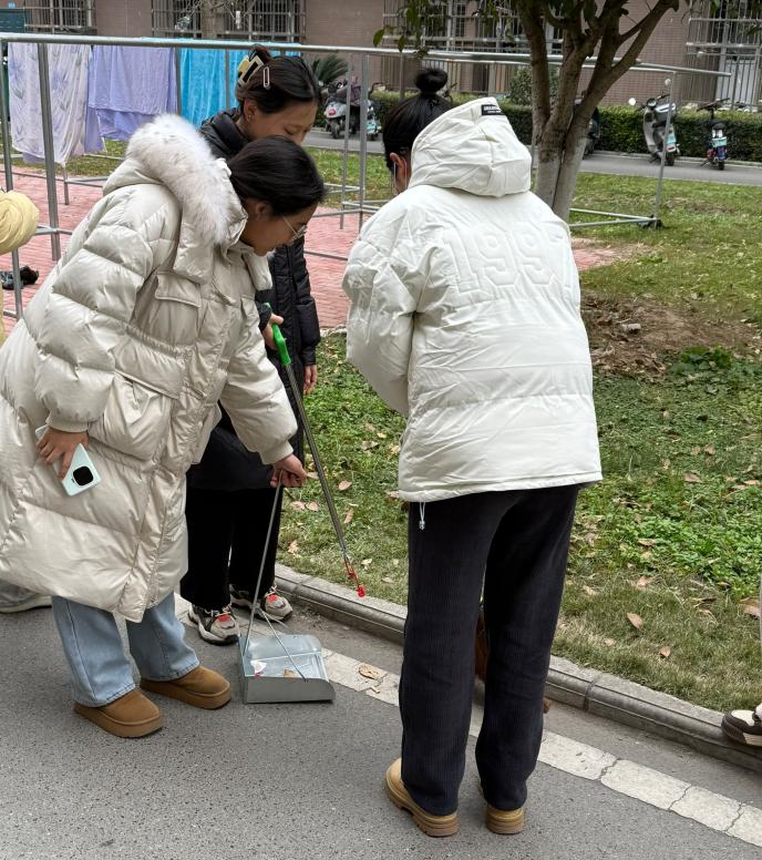 在带队老师和志愿者的带领下,同学们手持夹子,将散落在路边的纸屑、烟头、塑料袋等垃圾一一捡起,放入垃圾袋中。同时,手持扫帚的同学则细心清扫着路边小径上的落叶和尘土,确保每一寸土地都恢复其应有的洁净与清爽。