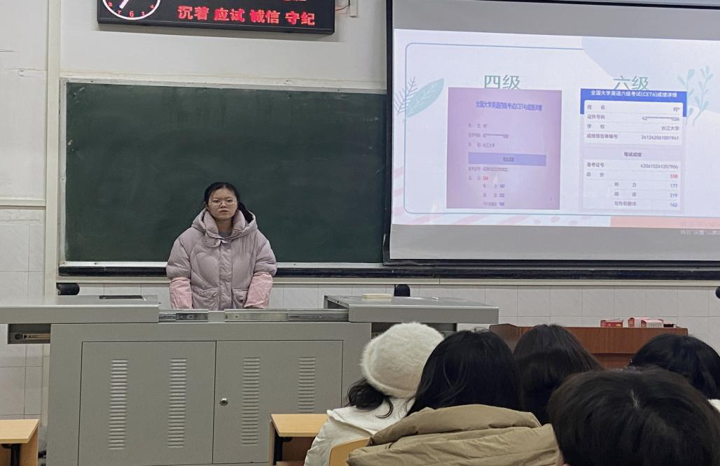 紧接着,曾祥上台为大家带来了精彩的分享。他详细剖析了四级考试各个题型的特点与解题策略,特别是在听力部分,他强调了预审、勾画、联想等做题技巧的重要性,并分享了在听力练习中遇到未听清、难听清情况时的补救措施。在阅读方面,曾祥讲述了如何快速定位关键信息的技巧,帮助同学们提高阅读速度和准确率。而在写作与翻译部分,他更是精心准备了句式模板和高级词汇汇编,为学弟学妹们的考前冲刺提供了有力的支持。此外,曾祥还分享了自己的备考时间规划与心态调整方法,提醒同学们要合理安排学习时间,避免考前焦虑,保持良好的心态面对考试。