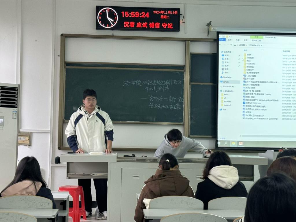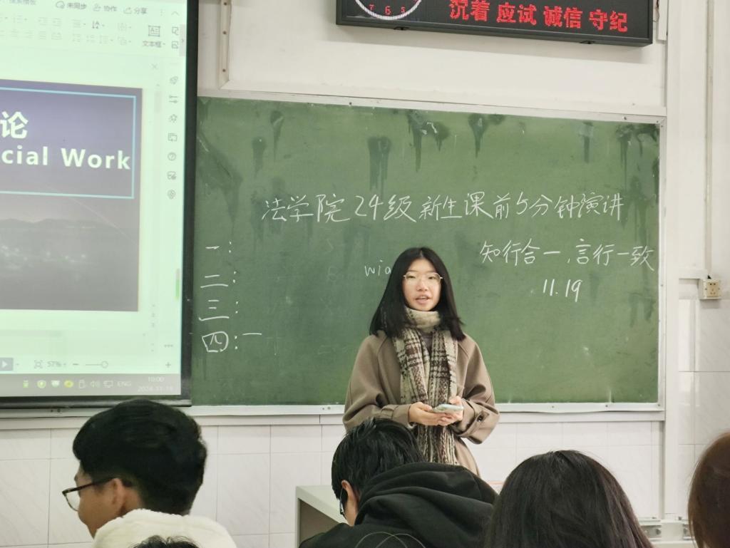 (通讯员彭灿)2024年11月18日至22日,williamhill中文为2024级新生精心策划并成功举办了一场以“知行合一,言行一致”为主题的课前五分钟演讲活动。此次活动意在激发青年学子以知识为引导,勇于实践,实现知识与行动的统一,言行举止的一致,从而在学习的道路上不断成长,在实践中锻炼成才。