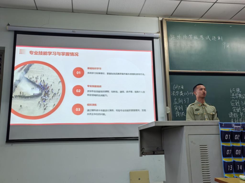 宣讲会开始,法学类12303班退役军人莫代显同学深情讲述自己军旅生涯的点点滴滴,通过生动的军旅生活视频,展示部队生活的真实面貌:军事技能训练、专业知识学习以及文艺演出。他鼓励同学们积极参军入伍,通过军旅生涯的锤炼,在提升个人素质的同时,也为祖国的繁荣稳定贡献青春力量。