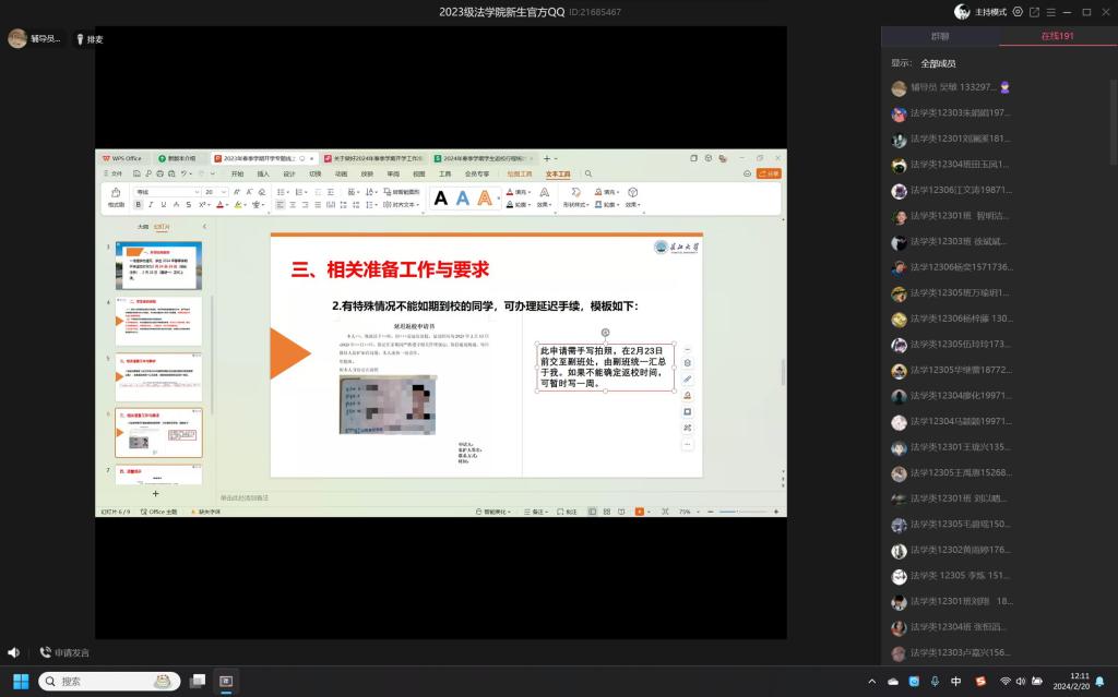 为确保2024年春季学期本科生与研究生开学和返校工作平稳有序开展,williamhill中文于2024年2月21日开展了线上安全教育主题班会,班主任参与,全体学生参加。