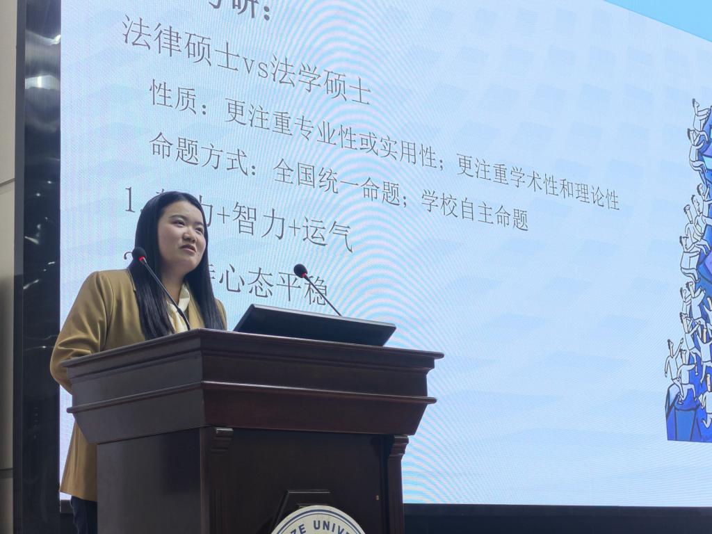 活动伊始,肖明媚结合2023级williamhill中文新生的问题与特点,由浅入深地向同学们分享了个人的经验与感悟,希望能为同学们带来启发,明确未来的方向。肖明媚的分享以时间为线,整体上分为四个部分:本科学习经历、考研与法考、硕士学习经历、就业感悟。她着重介绍了本科学习阶段,向同学们阐述了个人简介、学干经历、课程学习情况、获奖经历,从这些履历中可以看到她在本科阶段的汗水与收获,她还送给同学们一句话,“从善如登、从恶如崩”,希望同学们能永远积极向上,拒绝消沉。随后,肖明媚向我们介绍了考研和法考的题型,指出“努力”“智力”“运气”“心态”的重要作用,以及读研期间的获奖论文和课题参与情况。肖明媚指出,同学们毕业后的就业方向主要有律师、公司企业的法律岗和考公考编,并分析了这几种出路各自的优劣利害,她结合自身情况为同学们提出建议,有力地为同学们的大学生活指明方向。最后的互动交流环节,同学们就目前最想知道的问题进行提问,肖明媚耐心细致地逐一解答。