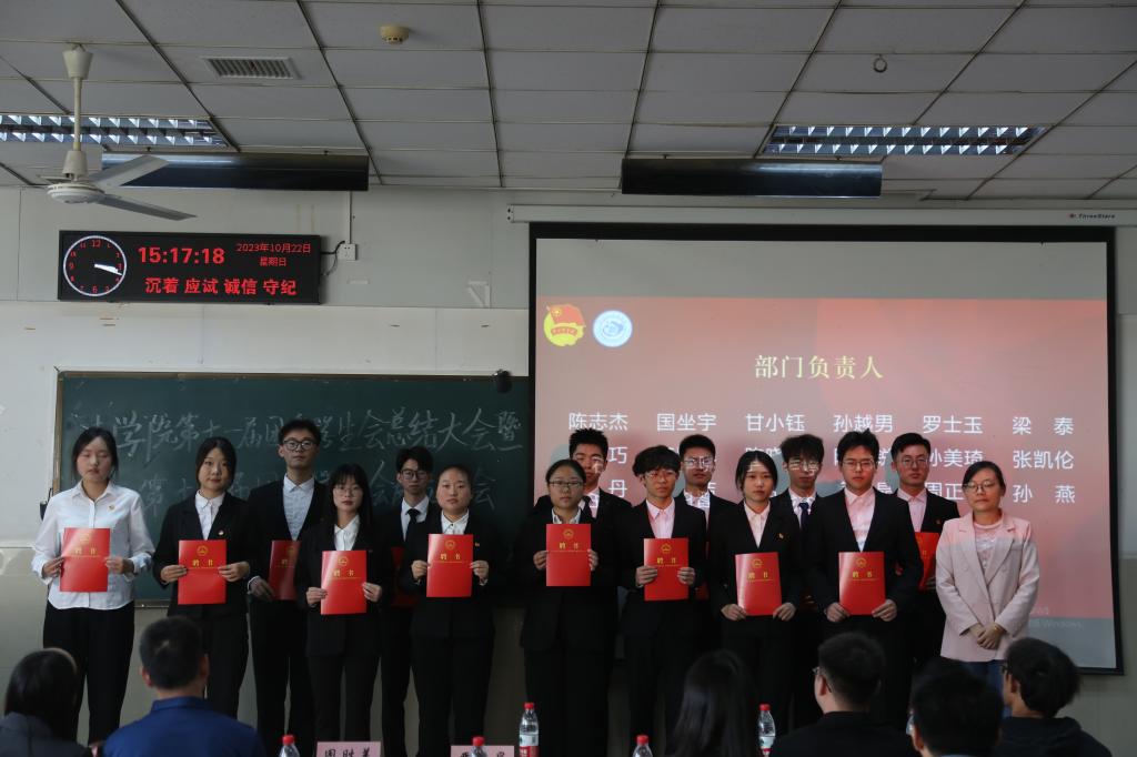 在庄严的国歌声中,大会正式拉开帷幕。为表彰第十一届团委学生会全体成员过去一年的踏实工作,大会首先为其颁发聘书和荣誉证书。本次大会还邀请众多嘉宾为这个值得铭记的时刻发表讲话,其中,第十一届团委学生会主席团代表冯其莉将立志做“有深度、有温度、有宽度”的学生组织作为她对院会发展的新期待;第十二届主席团代表田晋宇和新干事代表王梦苑上台发言时,也分别表达了对院会的工作要求与未来愿景。大会接近尾声,党委书记周胜美进行总结致辞,他提到:“看见学生会注入了这么多新鲜血液,我由衷地感到高兴”,话语间表达了对第十二届团委学生会全体成员的严格要求与殷切期望。最后,参会全体人员在横幅上签名表达祝福,并集体合影留念。