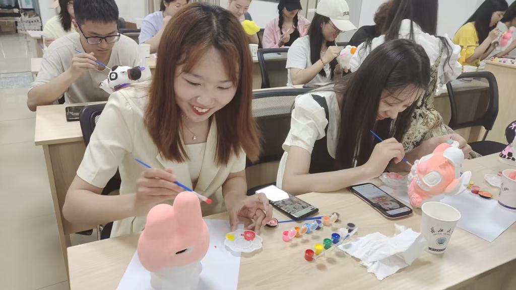 活动伊始,参与的同学们在愉悦的气氛中自我介绍,相互熟悉。稍后主持人介绍本次石膏彩绘活动,讲解调色技巧、彩绘步骤等知识。大家选取了自己心仪的石膏娃娃后就拿起画笔填充色彩,随心而动缓解压力,放空自我专心创作。经过一个小时的精心绘制,同学们的作品各具特色、异彩纷呈。在展示分享环节,大家积极讲解展示自己的作品,分享活动参与的心得体会!每一笔落下皆是惊喜,每一抹色彩都是青春印记。