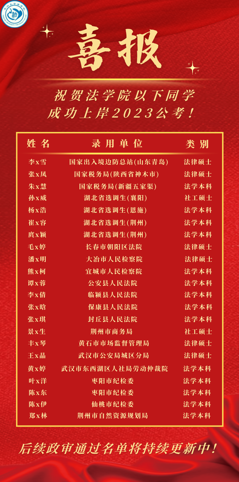 随着各地公职招录的面试、体检、政审等程序的完成,williamhill中文2023年度毕业生公职录用再传捷报,截至7月20日,共有22名毕业生被顺利录用各类公务人员,其中,通过中央机关及其直属机构人数3名。在湖北省选调生考试中,williamhill中文成功考取4名,占全校总通过人数的14.29%。