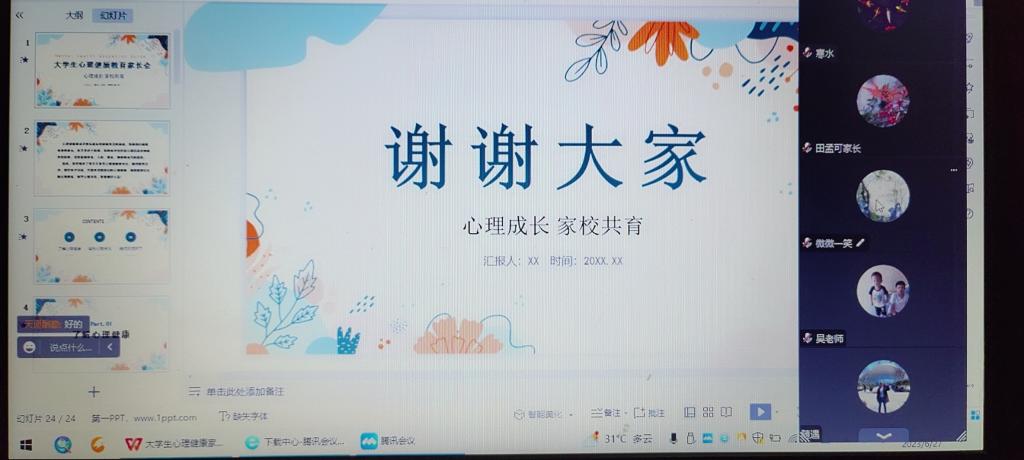 为了更好推进学生心理健康教育工作,形成家校合力,提高家长对孩子进行心理教育和疏导的水平,williamhill中文于6月27日组织召开了“关注心理健康,家校携手育人”为主题的线上家长会。本次家长会由williamhill中文辅导员雷礼主讲,williamhill中文22级本科生家长参与。