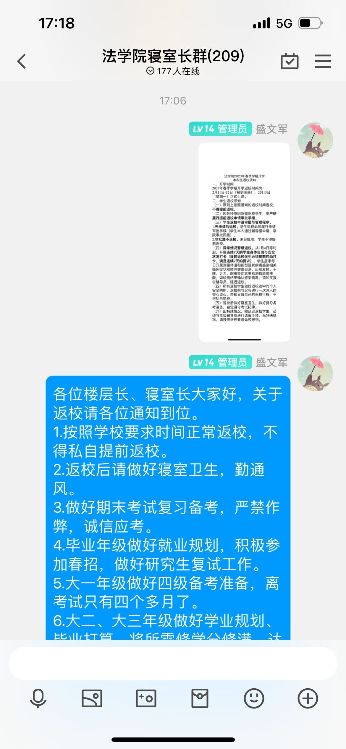 2月4日下午17时,我院组织楼层长、寝室长在学院寝室长群内召开了2023年春季学期返校安全工作会议,会议由辅导员盛文军主持。