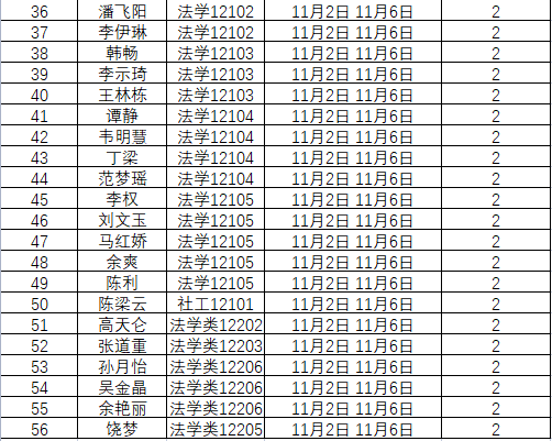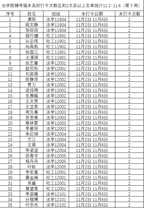 根据学校要求,2022年10月31日——11月6日(第十周)组织全体本科生进行每日“辅导猫”打卡。经分管辅导员、学工助理、班干部多次提醒,仍有56名同学未在规定时间内完成打卡,具体未打卡次数及日期如下:(表格显示)