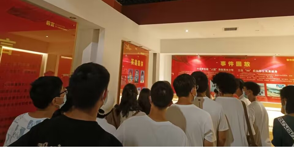 随后,同学们跟随讲解员来到了二楼,怀着敬仰与缅怀的心情了解回望英雄们的英勇事迹。2009年10月24日,十五名大学生为了抢救两名落水少年,迅速结成“人链”,下水救人,不幸的是,三人牺牲。长大学子用实际行动彰显了中华民族的传统美德,重新诠释了新时代的道德规范,充分展现了当代大学生无私奉献的精神风貌。看着英雄的遗物,听着讲解员的解说,在场的学生无不眼眶泛红。