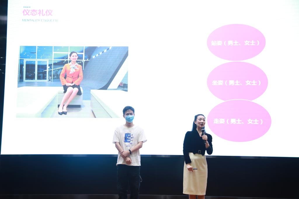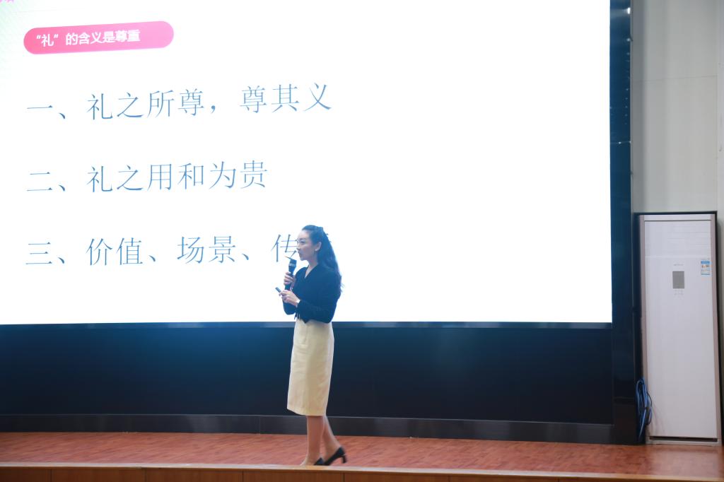首先,阳丹老师以“什么是礼仪”引出本次培训的主题,以“礼仪”中“礼”和“仪”的释义展开本次讲座。阳丹提出“学习的专业知识在未来会展现我们的价值,而实现价值前需要先获取外在的门票。”在未来职场中,作为一名社会人,首先展现的是仪表,因此要注重行为礼仪的培养。在讲座中,阳丹老师邀请同学上台互动,从站、坐、走三个方面生动展现了不同姿态给人的不同印象,她强调微笑也是一种社交礼仪。