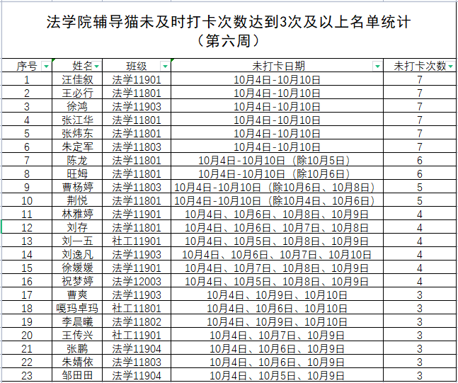 根据学校要求,2021年10月4日-10月10日(第六周)组织全体本科生进行每日“辅导猫”打卡。经分管辅导员、学工助理、班干部多次提醒,仍有23名同学未在规定时间内完成打卡,具体未打卡次数及日期如下:(表格显示)