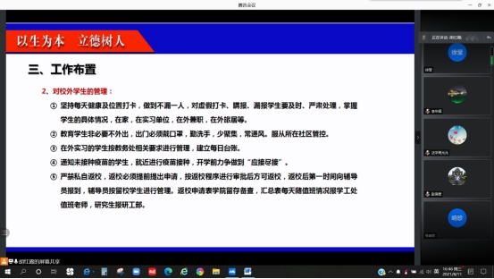 会议要求班主任、辅导员将会议精神通过班会、QQ群、微信群等方式让每位学生知晓并遵守要求。