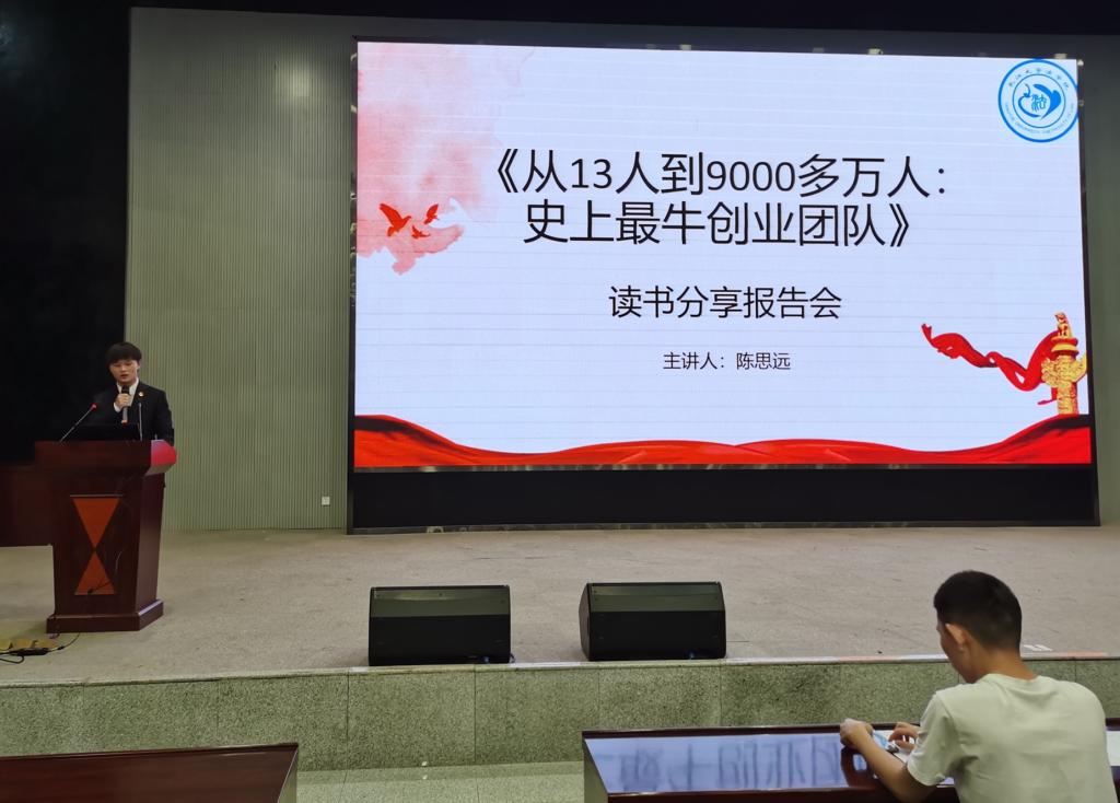 在读书分享交流会上,法学类32006班陈思远同学分享书籍《从13人到9000多万人:史上最牛创业团队》,讲述中国共产党从成立到逐步发展壮大的过程。法学类32001班何钰滢同学从《再走长征路》中感悟长征精神对当代青年的重要意义……同学们分享读书感悟,纷纷表达对党和国家的热爱。