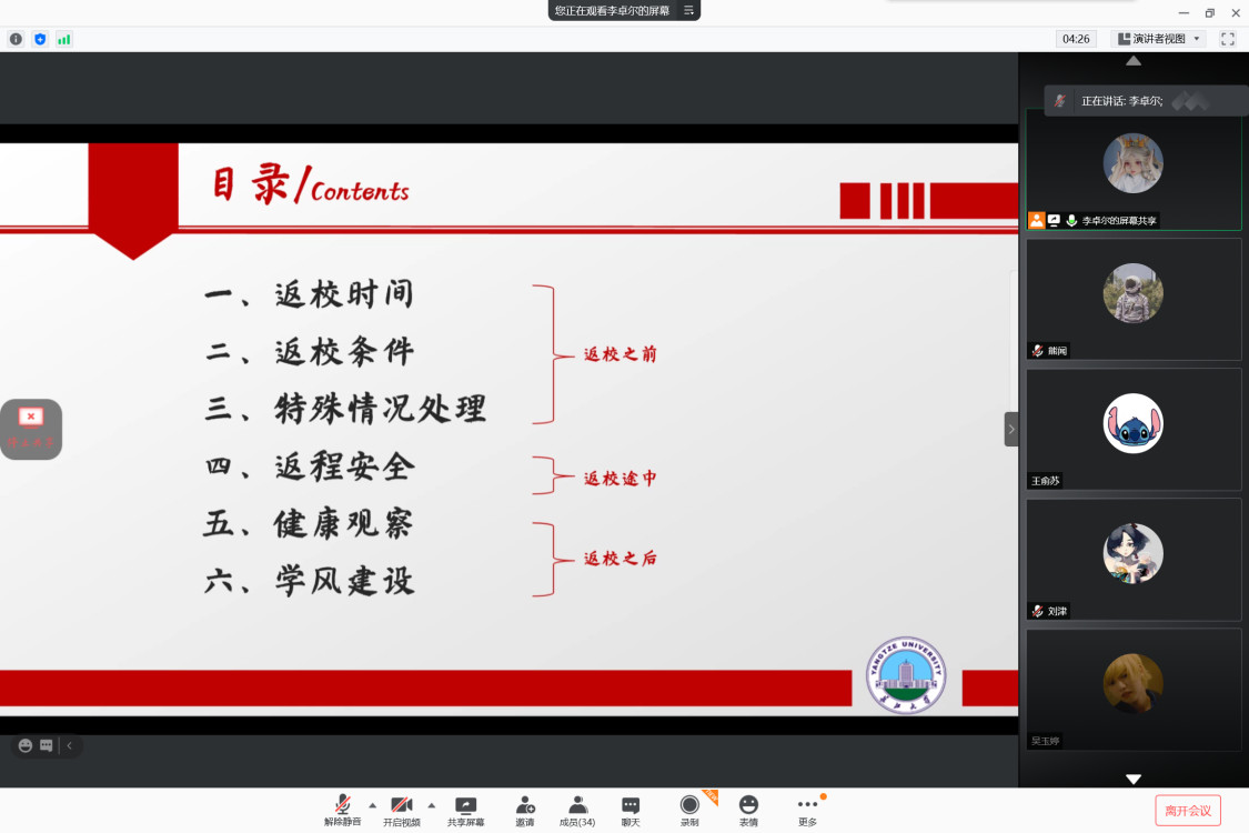本次班会由返校时间、返校条件、特殊情况处理、返程安全、健康观察、学风建设六部分组成。首先提醒学生返校时间为2月27、28号两天,禁止学生提前返校。稍后向学生们讲解了返校需要的条件及一些特殊情况处理。然后,强调了返程安全,告诫学生们一定要从正轨渠道购票,返程途中注意个人财产保护,与家人保持联系并做好个人防疫安全。返校后会有一周的健康观察期,在这期间学生非必须不出校园,每日开展个人健康状况监测,也要做好个人卫生与防护。最后,特别强调了学风建设,告诫大一学生英语四级考试的重要性,要求每个学生都重视对英语的学习,要加强专业学习,营造良好学风,共创班级学习氛围。