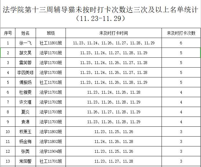 根据学校要求,2020年11月23日-11月29日组织全体本科生进行每日“辅导猫”打卡。经分管辅导员、学工助理、班干部多次提醒,仍有13名同学未在规定时间内完成打卡,具体未打卡次数及日期如下:(表格显示)