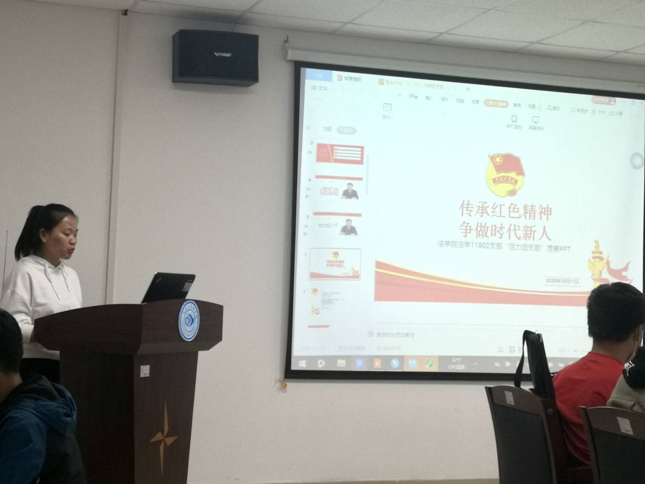 接着,法学11802班团支部的马丹丹同学利用PPT形式,多角度、全方位展示了团支部的工作、学习及日常。他们严肃而不失活泼,既能俯身研学又能发展个人爱好。马丹丹同学介绍到:“新时代,我们不仅需要培养“六有”青年,更要提升综合素质,争做新青年。如此才能担当时代复兴的大任,做合格的新时代的建设者、社会主义接班人。”