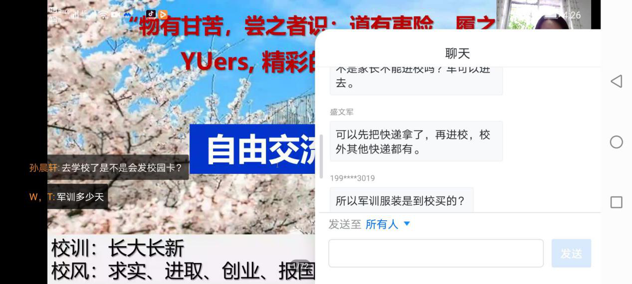 会议最后为自由交流环节。同学们提出了许多关于来校报到及学习生活等方面的问题,老师们在线为同学们一一解答,为新生报到做好了充足准备。