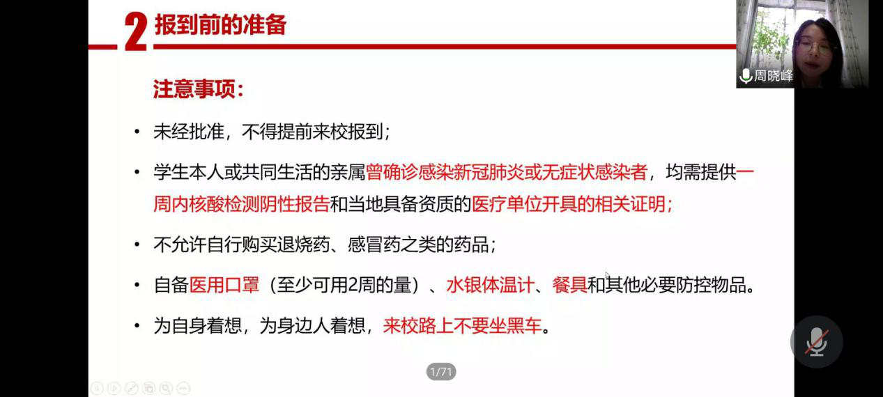 周老师先进行了简单的自我介绍,然后分别从学院简介、来校报到流程、注意事项以及疫情防控等方面进行了说明,重点强调了新生报到的流程及到校后的疫情防控要求,希望新生们可以坚持每日健康打卡,严格遵守学校的疫情防控规定。最后,胡书记对新生做出了几点要求:一要遵守学校的疫情防控要求,二要做到有责任有担当,三要心存梦想,在大学的海洋里,希望同学们能够扬帆起航,追逐自己的梦想。