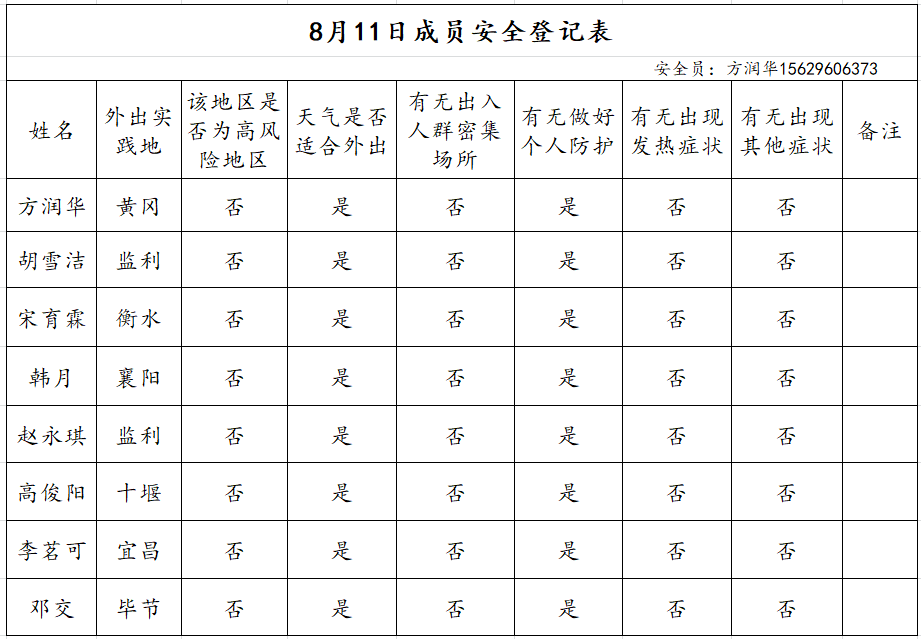由于全国新冠肺炎疫情并未完全退散,8名实践服务志愿者在确保安全的前提下,在学院老师的指导下,坚持就近就便的原则,采用“云组队”形式,在湖北十堰、黄冈、襄阳、宜昌、监利,湖南长沙、贵州毕节、河北衡水等不同地区开展《民法典》的宣传和调研活动。团队以学习《民法典》、宣传《民法典》和普及《民法典》为主要任务,以引导民众形成遇事找法的习惯,培养民众解决问题靠法的意识,提高民众以法化解矛盾的能力为根本目的。此次活动设有安全员1名,每日登记所有队员的身体健康状况。