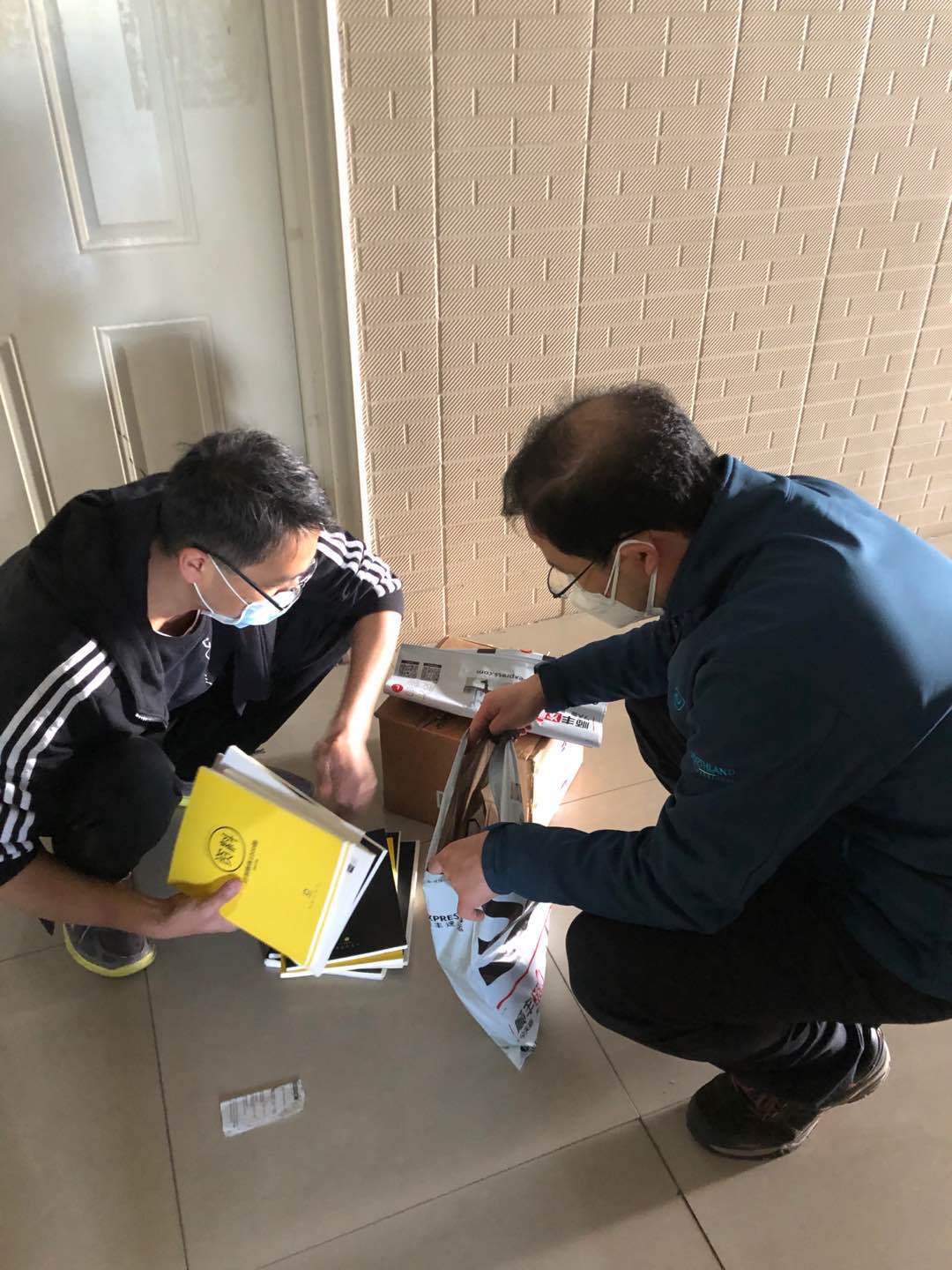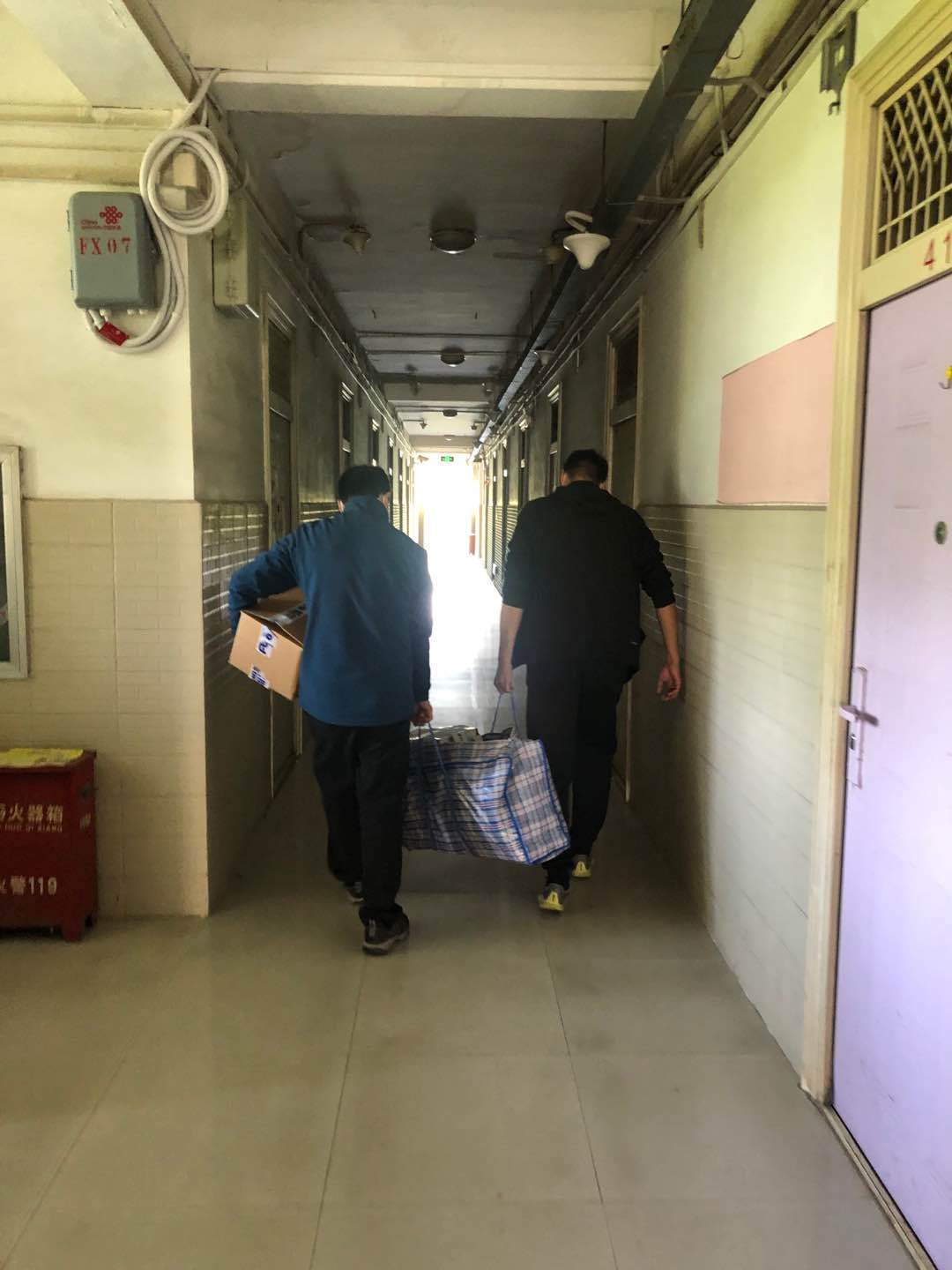 从上午9点一直忙到下午5点,从进入宿舍开始,找寻物品、打包、贴标签,每个过程都在学生视频确认下进行。当天为75名同学集中办理了电脑、学习资料、重要证件的邮寄工作。