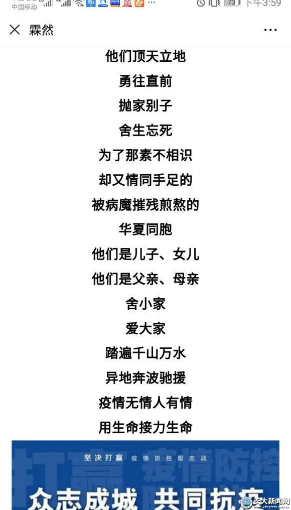 周然林通过微信朋友圈、个人微信公众号等平台,创作多首歌颂战疫英雄、祈盼疫情结束的诗歌,表达了他对前线医护人员的感恩与敬仰。作为一名法学生,他还向周围的村民宣传疫情相关法律知识,告知他们不造谣、不传谣、不串门,积极配合体温检测等工作。