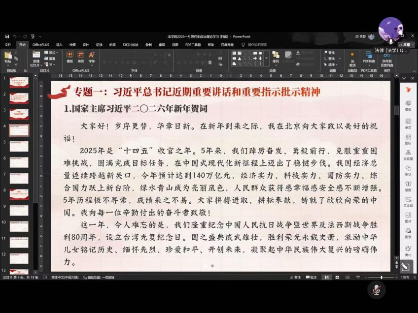 辅导员盛文军在总结讲话中对本次学习活动的成效给予肯定。他强调,政治理论学习是研究生成长成才的重要根基,全体研究生要持续深化理论学习,坚持学思用贯通、知信行统一,切实把思想和行动统一到党中央决策部署上来,结合法学专业优势,主动对接国家和地方发展需求,在推进法治中国建设、服务湖北高质量发展的进程中展现青春作为。