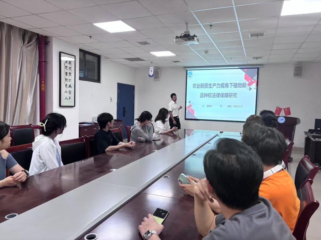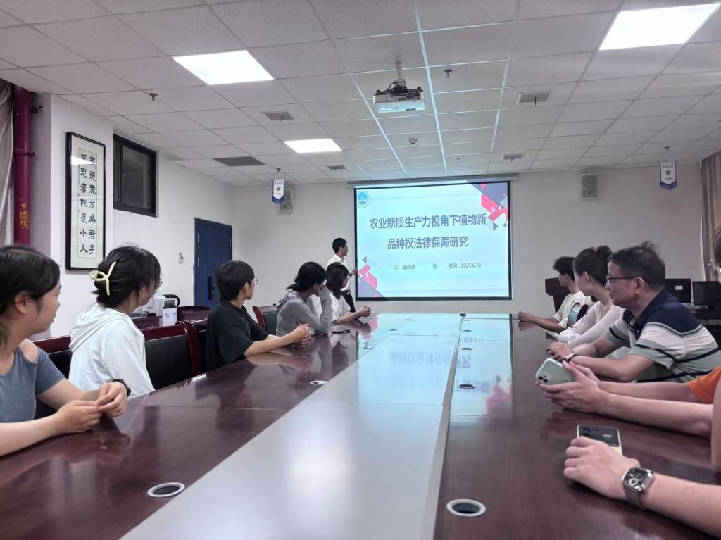2025年6月13日,我院胡骑兵教授在文科楼203会议室主持了一场主题为《农业新质生产力视角下植物新品种权法律保障研究》的学术沙龙。实习实训中心主任陈群辉等多名导师和19名研一研二同学一起参与,现场学术氛围浓厚。
