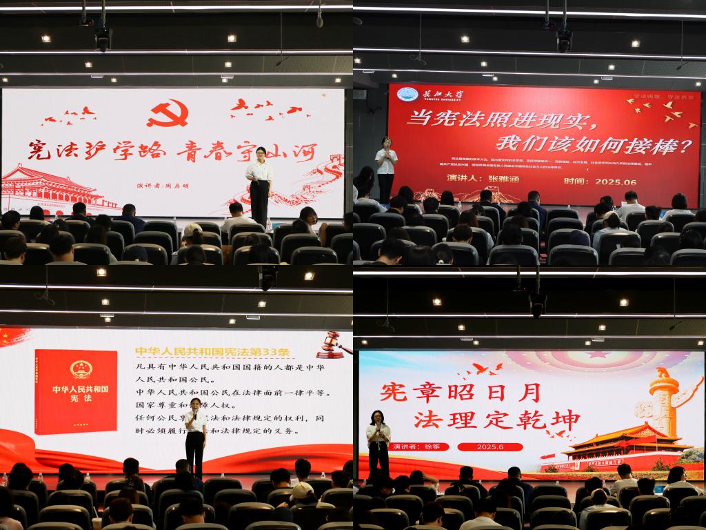 决赛现场,17位来自不同学院的参赛选手紧扣主题,以社会热点为镜,以亲身经历为笔,勾勒宪法的时代轮廓。马莉钦同学以亲历的社区服务为切入点,温情勾勒宪法出以润物无声的方式改善银发群体生活图景,让"宪法守护民生福祉"的抽象命题化作触手可及的温暖现实;王羿茹同学则选取劳动权益纠纷典型案例,以犀利的法律视角剖析宪法修正案如何为劳动者筑起“离线休息权”的法治屏障,深刻诠释宪法作为“治国安邦总章程、公民权利保证书”的时代内涵。其他参赛者亦聚焦校园法治建设,探讨“宪法与校园欺凌防治”、“宪法与反诈意识”,以青春视角解构宪法精神,用真挚情感传递法治信仰,赢得阵阵掌声。