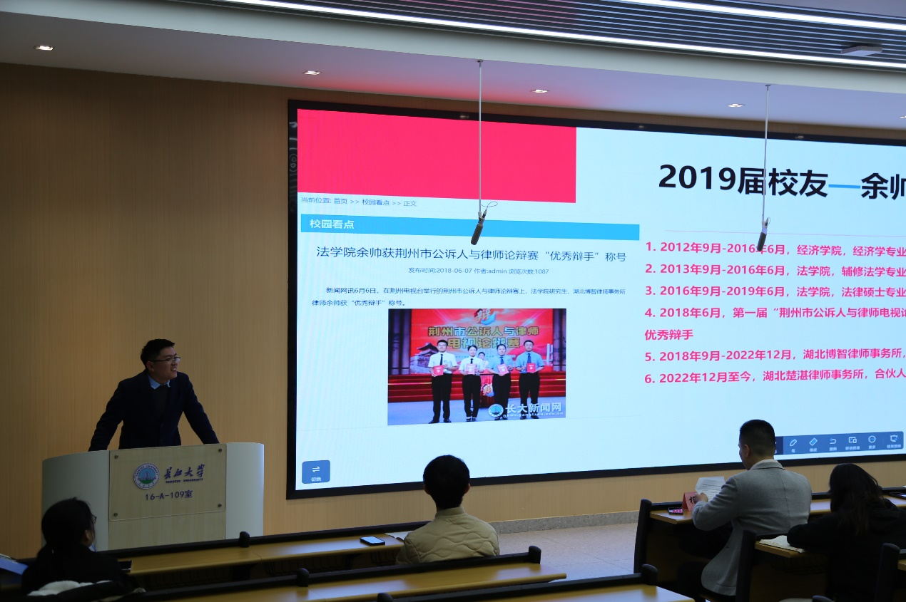 接着,曾经辅修法学专业的优秀校友——湖北楚湛律师事务所合伙人余帅律师,分享了他在williamhill中文辅修、深造、成长的心得体会。他的经验之谈,为新同学们提供了可资借鉴的范例和启示,点亮了求学之路,坚定了职业信心。