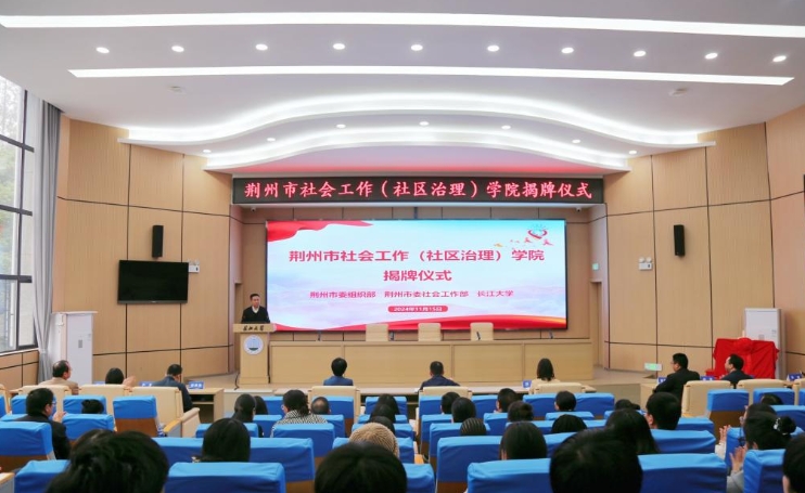 11月15日,荆州市社会工作(社区治理)学院揭牌仪式在东校区11教学术报告厅举行。校党委常委、副校长吕一兵,荆州市委社会工作部部长、市委两新工委书记谢清,荆州市委组织部副部长刘艳出席会议。