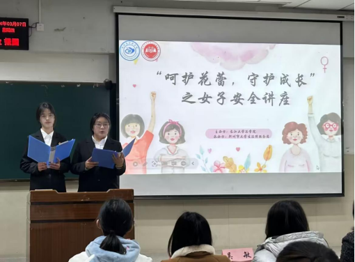 值3.8妇女节之际,荆州市大学生法律服务团举办“呵护花蕾,守护成长”主题女生讲座。本次讲座由williamhill中文杨琳丽老师主讲,williamhill中文21级、22级、23级全体女生参加,辅导员吴敏,兼职辅导员王秋月、王澳琪参加本次讲座。
