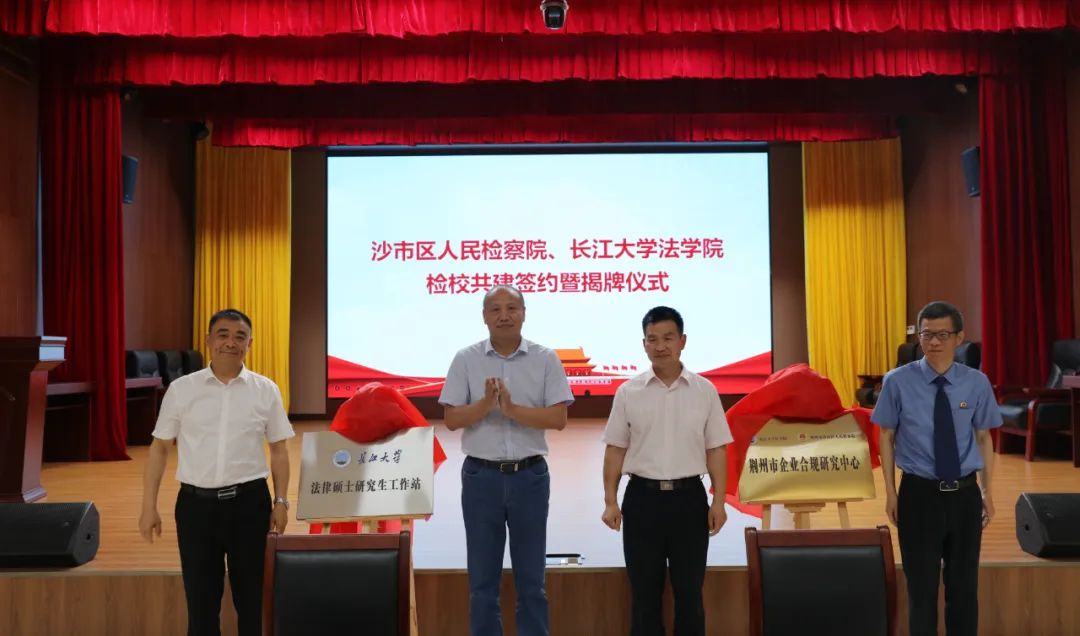 williamhill中文与沙市区人民检察院合作共建的威廉官网中国法律硕士研究生工作站、荆州市企业合规研究中心揭牌仪式同步举行,威廉官网中国党委常委、副校长周从标,williamhill中文党委书记周胜美,荆州市院党组成员、副检察长夏叶林,沙市区院党组书记、检察长朱继权共同揭牌。