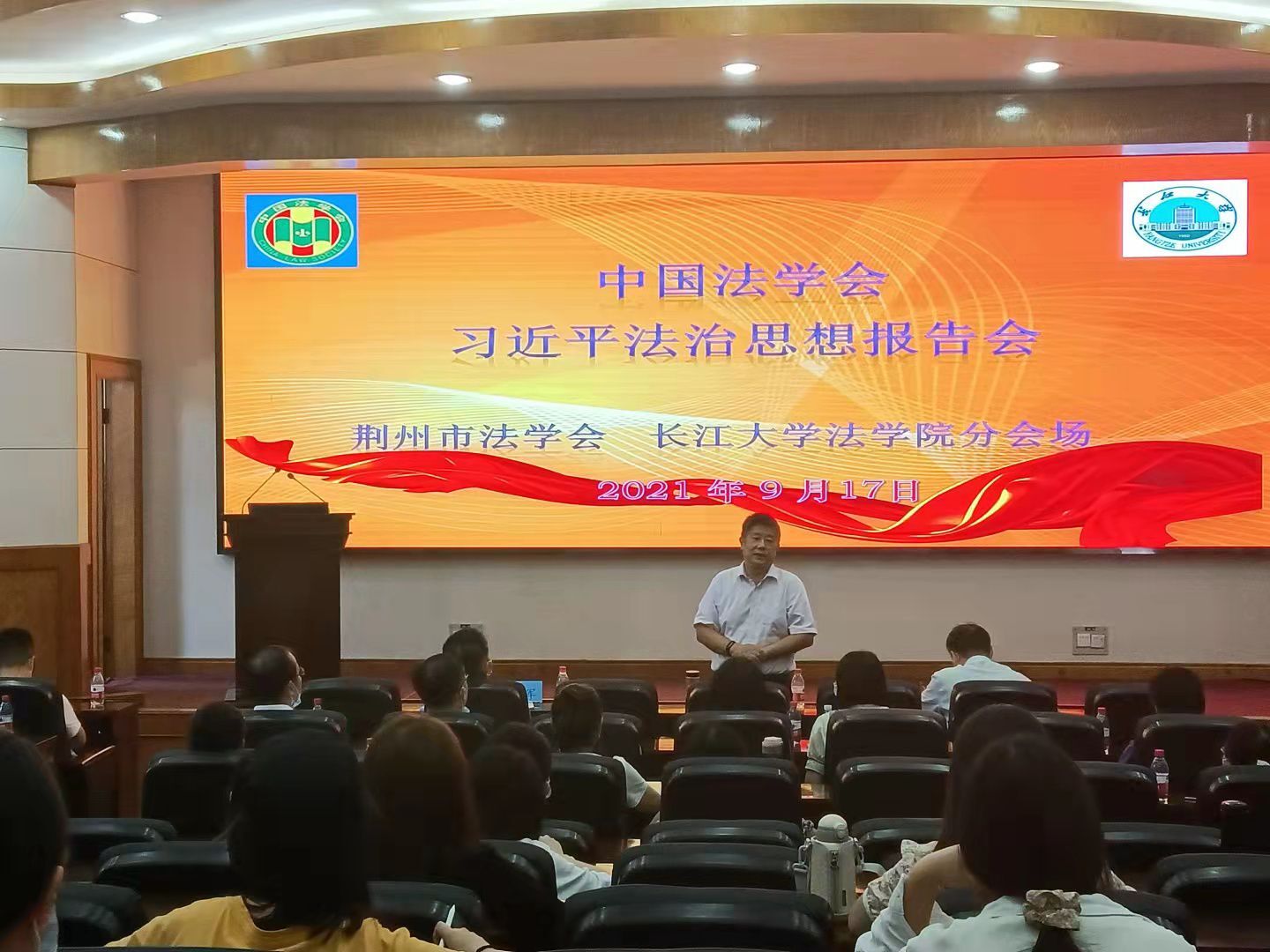 报告会由中国法学会、习近平法治思想研究中心主办,在中国法学会融媒体中心演播室以网络直播形式举办,荆州分会场设在威廉官网中国11教学术报告厅。荆州市法学会机关、荆州区、沙市区法学会负责人,williamhill中文教师和研究生共80余人在分会场集中参加学习。