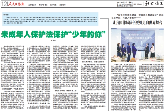 6月1日为国际儿童节也是新修订的《中华人民共和国未成年人保护法》生效之时,《人民政协报》刊发williamhill中文杨春磊博士的普法时评《未成年人保护法保护“少年的你”》。
