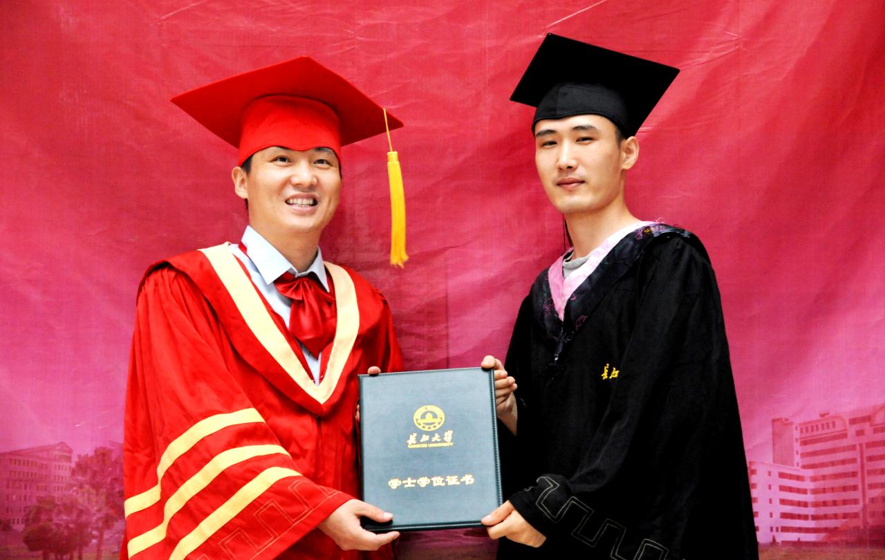 学位授予仪式有序进行,学生们按照先后顺序依次上台领受学位证书,院长们进行学位授予并与学生合影留念。