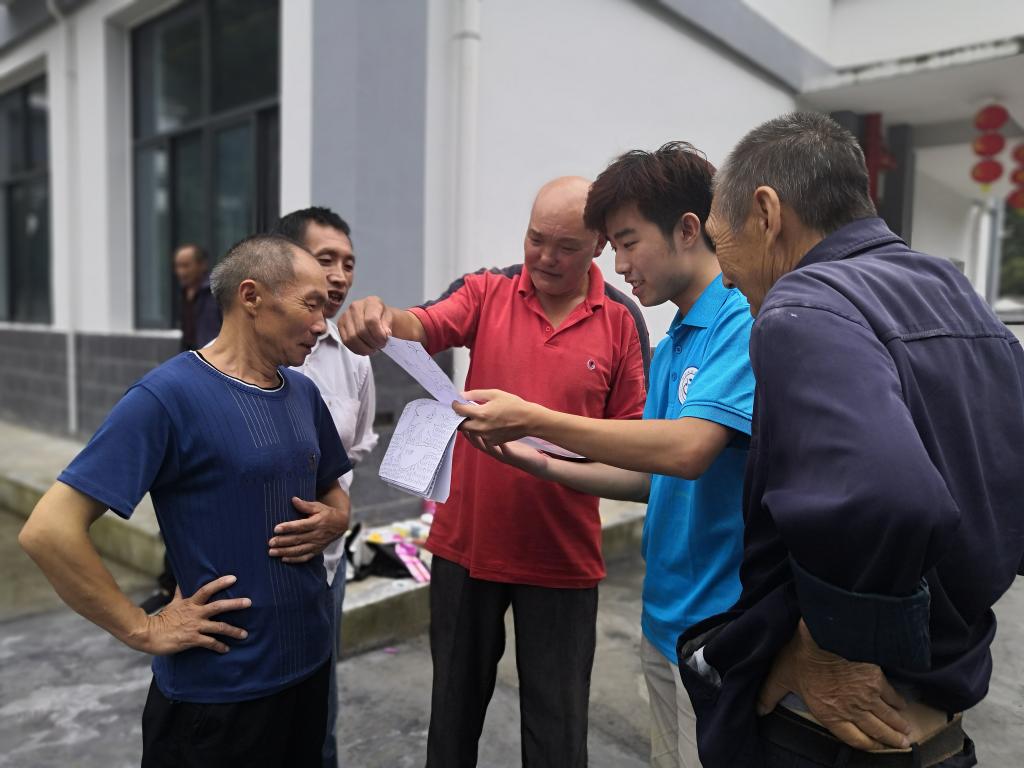 图为法治宣讲团成员引导村民填写调研问卷 通讯员 鲍淘滔 摄