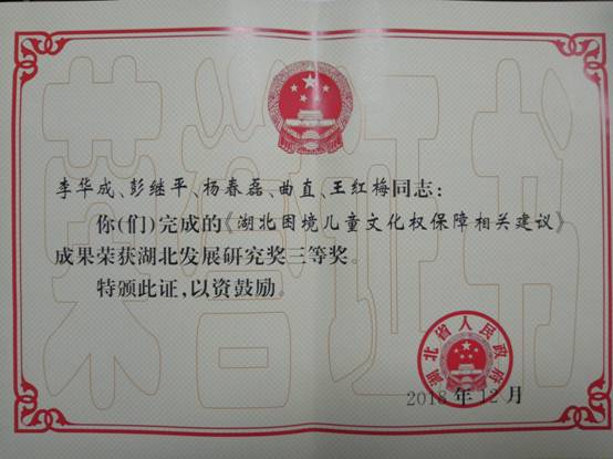 近日,湖北省人民政府发文《省人民政府关于颁发湖北发展研究奖的通报》(鄂政发[2018]52号),荆州市人大常委会委员、williamhill中文副院长李华成博士团队研究成果《湖北困境儿童文化权保障相关建议》获三等奖。