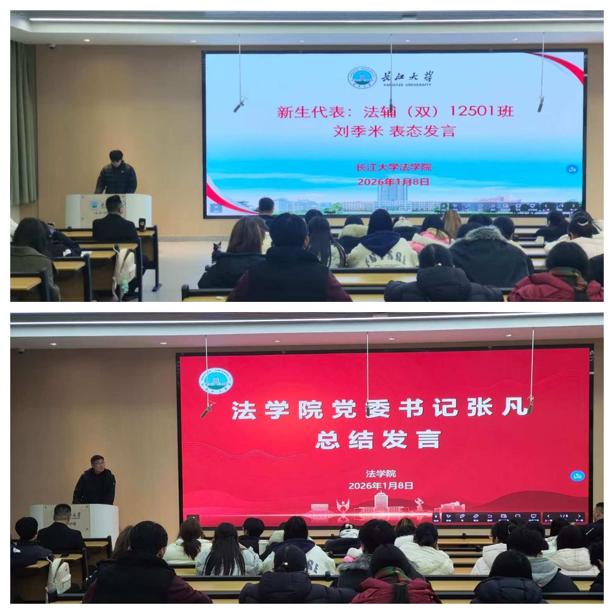 新生代表,社会体育指导与管理专业学生刘季米表达了加入法学学习的期待与决心,承诺将统筹主修与辅修学业,积极参与课程与实践,努力成长为兼具专业能力与法治素养的新时代人才。