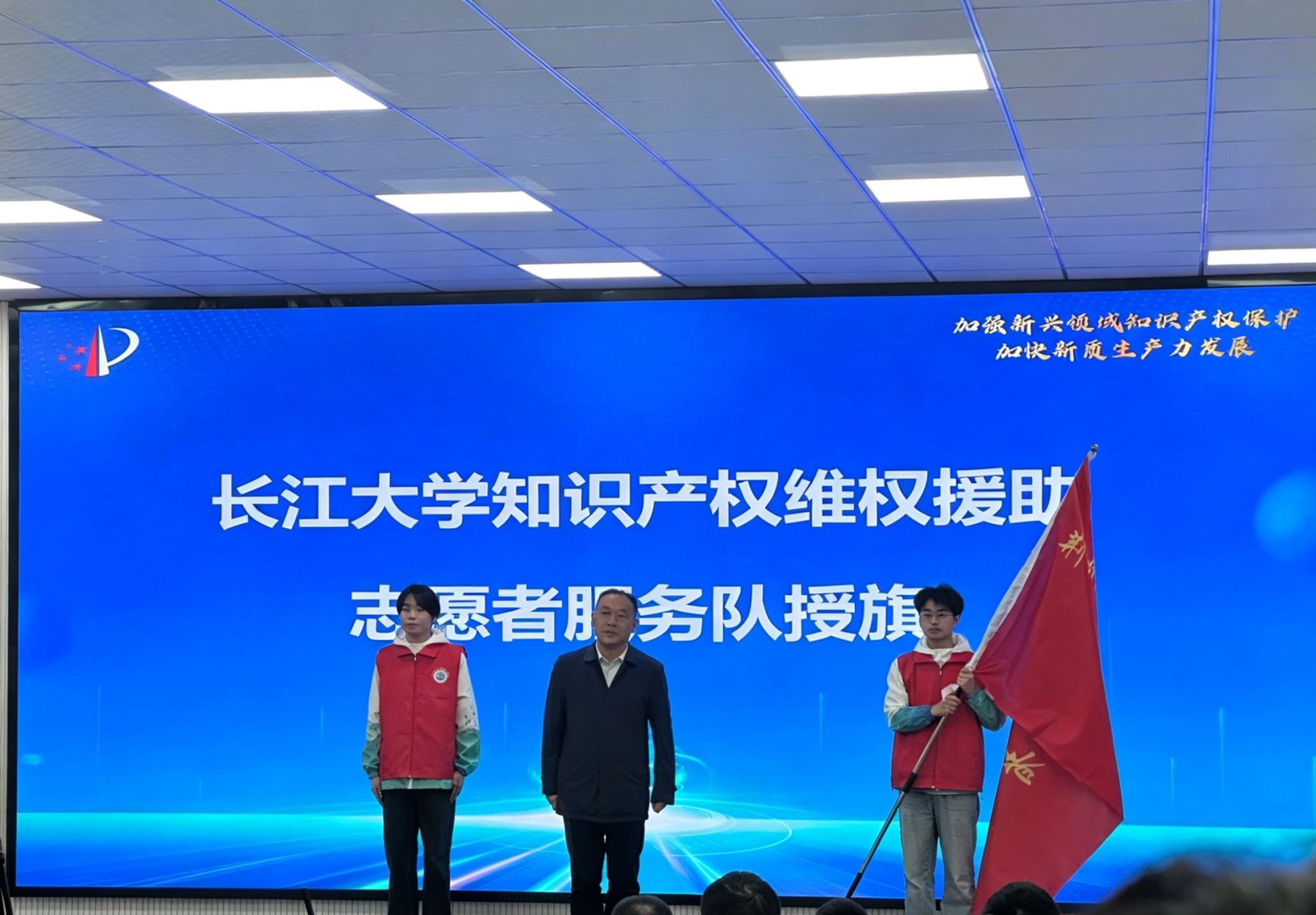 本次活动由荆州市市场监督管理局(荆州市知识产权局)、荆州市科学技术协会、威廉官网中国联合主办,威廉官网中国科学技术发展研究院、湖北省知识产权培训(荆州)基地承办。启动仪式上,威廉官网中国科学技术发展研究院常务副院长徐辉结合地方产业发展实际,强调高校在知识产权人才培养、成果转化中的重要责任与使命。志愿者代表刘轩、肖天宇从荆州市副市长严广超手中接过队旗,正式加入荆州市知识产权志愿服务队。旗帜所承载的,既是荣誉与认可,更是传播知识产权理念、服务创新发展的时代责任。