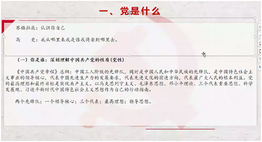 课程第二部分:中国共产党员的条件与职责。周书记在解释成为中国共产党党员的条件的基础上,结合同学们的学习生活实践给出了众多建议。大学生们要认真学习,积极参与、开展学生活动,广交诤友,在竞争中不断提升自我,为更好地履行相关职责提供自身条件。周书记特别强调了党员的八项义务,热心叮嘱同学们严格要求自己,不断进步。