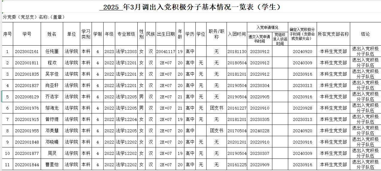 为加强入党积极分子的培养、管理和教育,保证党员发展质量,根据《williamhill中文入党积极分子动态管理办法》规定,经所在党支部严格审查,支部委员会(不设支部委员会的由支部大会)会议讨论决定,并报williamhill中文党委(党总支、党工委)备案,拟将任纯墨等11名同学调出入党积极分子队伍,按入党申请人身份对待,现予以公示。公示时间:2025年3月17日至2025年3月23日(公示时长一般为7天,含5个工作日)。