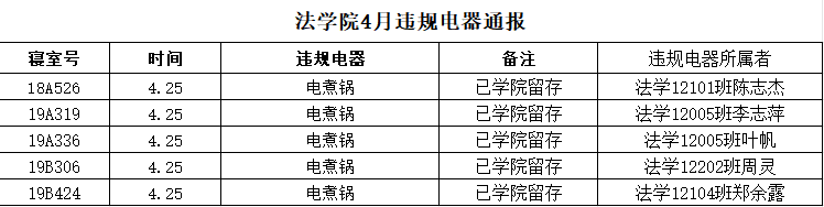 根据学校四月宿舍检查情况,我院共有5间寝室存在违规物品,具体情况如下:(表格显示)