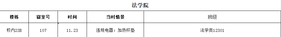 根据学校十一月宿舍巡查情况,我院共有1间寝室使用违规电器,具体情况如下:(表格显示)
