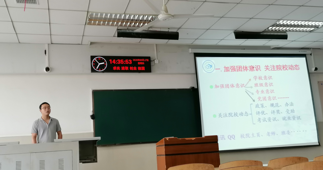 盛文军老师主要从院校动态、就业现状分析和毕业前的准备三方面展开讲述,倡导2017级学生增强就业意识,关注多方资源信息,勇于走进招聘现场。盛老师首先提倡同学们加强团体意识,密切关注学校就业信息网,重点把握校园招聘信息,强调了学生关注就业信息的重要性,并为学生们分享了一些知名的招聘网站。通过分析2020届毕业生的就业现状,盛老师建议大家把握好未来发展的方向,设立一个毕业目标,同时鼓励同学们努力学习,拼搏出一个更好的明天。随后盛老师着重讲解了生源地信息填写问题,对毕业生求职补贴的申报对象和申报材料也进行了详细的介绍。随后盛老师向2021届毕业生们介绍了毕业前需做的准备工作,详细讲解了国家的就业政策和报到证等重要事项。会议最后,胡书记以当下的就业现状切入,从三个方面动员大家积极就业。首先毕业生需要转变就业观念,端正就业态度,树立合理明确的目标;第二要转变求职思路,灵活应变不同的就业情形,随时调整;最重要的是要树立与国家共命运的就业观,作出与国家发展相契合的职业规划,在国家需要的地方发挥自己的价值。