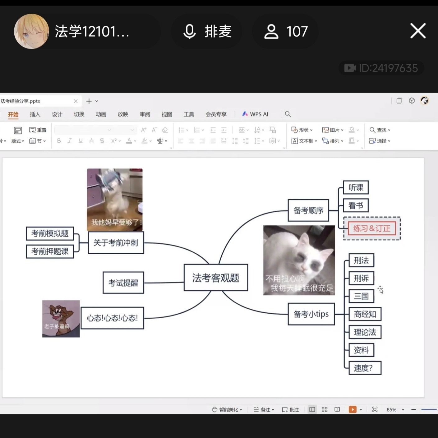 会议伊始,法学12101班陈志杰同学开始分享经验。在学习方法上,他以“科目特性导向学习法”为核心,针对民法、刑法等理解性较强的科目,强调要注重案例分析,通过实际案例加深对知识点的理解;对于理论法等记忆性较强的科目,则提出要巧用记忆口诀,构建知识框架,提高记忆效率。同时,他特别指出:“真题是最优质的备考资源,错题本是查漏补缺的黄金工具”。