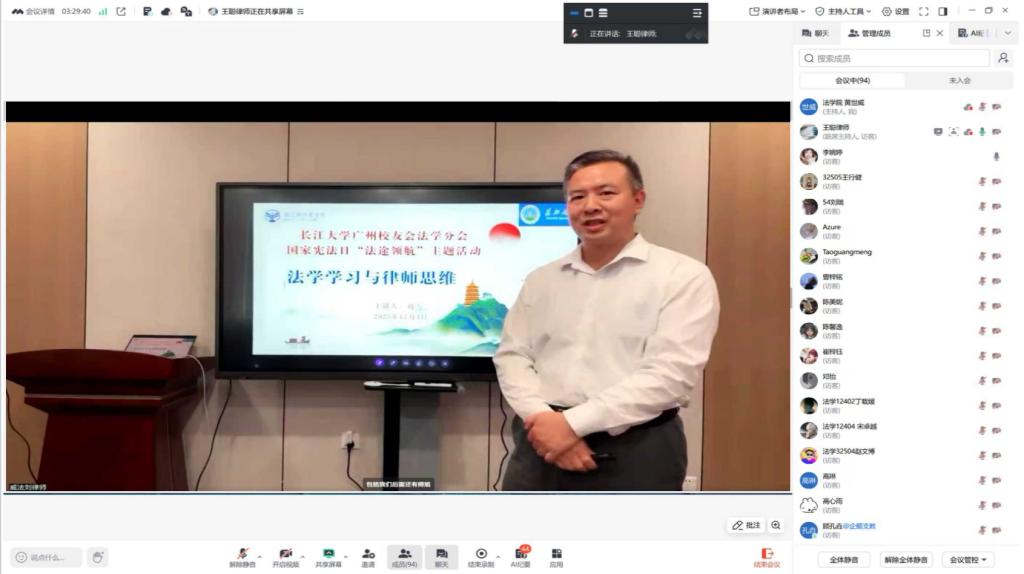 (通讯员 姚水根)为迎接宪法日,助力学子明晰职业方向,促进理论与实务融合,12月4日下午,williamhill中文于线上成功举办“法途领航”生涯人物分享讲座。本次活动特邀广东威法律师事务所主任刘雪、广东法制盛邦律师事务所专职律师李锐、北京市天元(广州)律师事务所律师王聪担任主讲嘉宾,williamhill中文部分研究生及本科生共同参与。